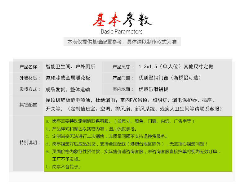 環(huán)保公廁充分考慮了無障礙通道、無障礙設(shè)施的配置,設(shè)置殘疾人專用間、母嬰間,安裝老年人坐便器等,方便不同群體使用。在公廁內(nèi)安裝自動(dòng)排風(fēng)換氣設(shè)備,在遼河公園河道處等不具備復(fù)雜施工條件的地方修建造價(jià)低、施工快、易裝拆的裝配式廁所或移動(dòng)廁所,采用發(fā)泡技術(shù),更清潔、效率高 、節(jié)水、環(huán)保。崗?fù)ぬ厣褐鞑模簝?yōu)質(zhì)鍍鋅板氟碳噴漆。崗?fù)け砻娼?jīng)特殊工藝處理,美觀、大方,屬歐式小形崗?fù)復(fù)?nèi)設(shè)配電、照明等,方便管理人員使用。咨詢電話:15822882616,公司網(wǎng)址:www.sqjskj.com。