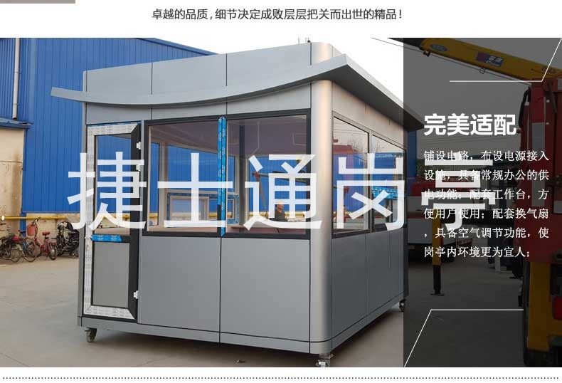 此款商品為氟碳噴涂氟碳噴漆的一款保安崗?fù)?,形象美觀,自然大方,可以用于工廠,行政機(jī)關(guān),開發(fā)區(qū)管理收費(fèi)處,室外辦公室等,用的場合比較多,實(shí)用性比較大