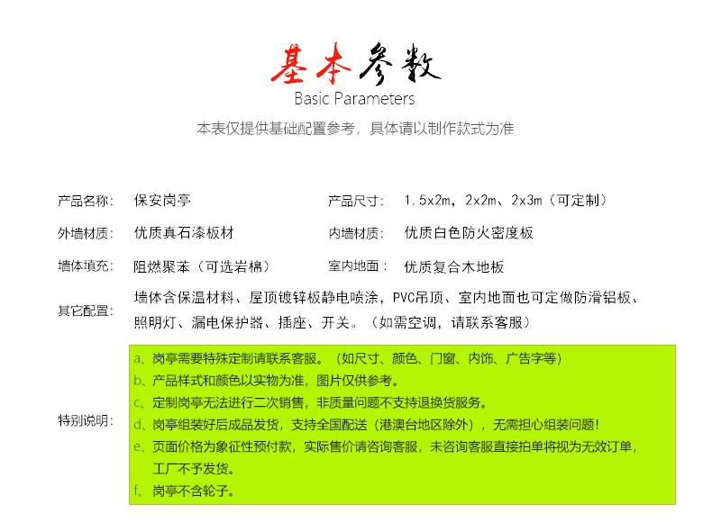 | 類型 | 保安崗亭 | 顏色 | 可定做 | 運輸方式 | 公路運輸 | ||