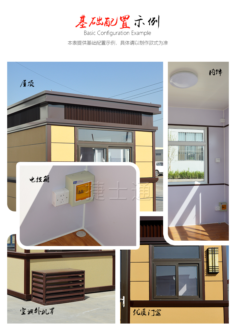 標準配置:保安崗亭墻體含保溫材料,屋頂鍍鋅板靜電噴涂,PVC吊頂,地板為復合木地板,可定做防滑鋁板,電箱、開關、插座、暗敷電線、照明燈、桌面、抽屜、鍵盤托、空調(diào)架等;可加配:空調(diào)等。聯(lián)系電話:15822882616,公司網(wǎng)址:www.sqjskj.com