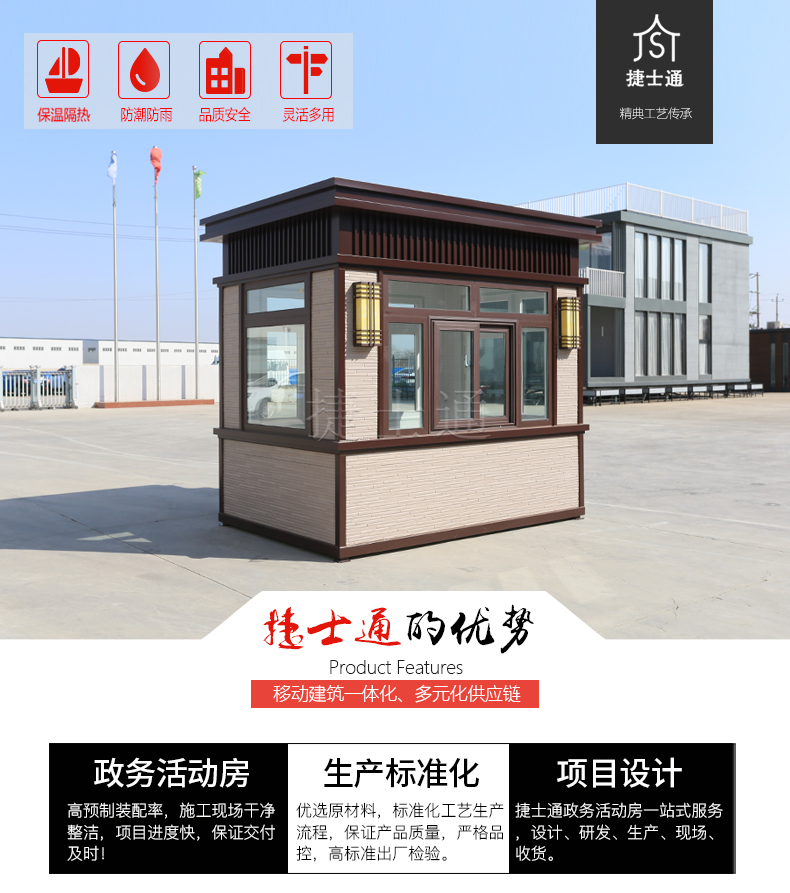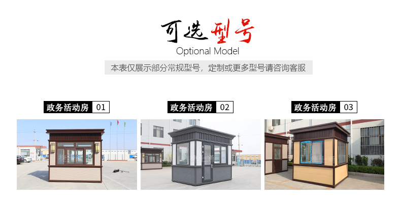 華夏款高端成品崗?fù)?/a>采用多種高端防褪色、防火、耐污性好、抗水性好、水性環(huán)保、使用壽命長(zhǎng)、外墻硬度高的現(xiàn)代化高端外墻板(可選),室內(nèi)裝修完善,可鋪復(fù)合木地板、防滑鋁板(可選),墻體有保溫隔熱層、屋頂采用高端多層保溫防水屋頂,配電完善(照明燈、漏電寶華、插座、開關(guān)等)
