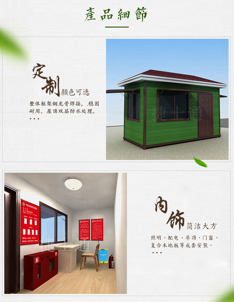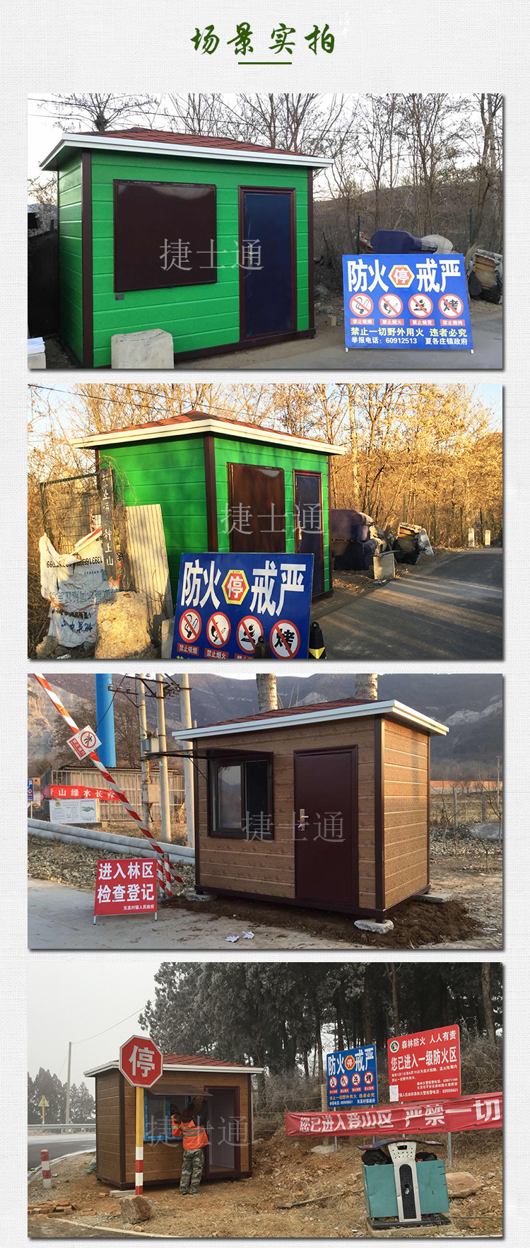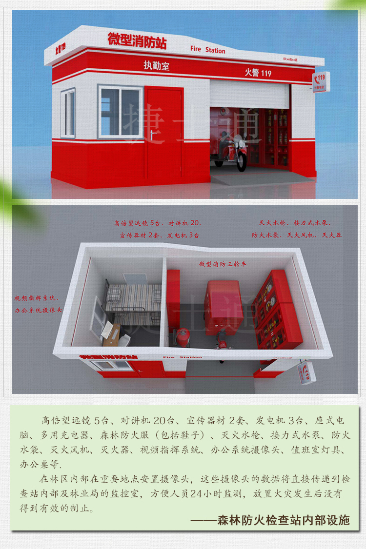 檢查站的工作人員要嚴格對進入林區(qū)的人員、機動車實施檢查和教育,扣留火種并對人員、車輛做好登記。 為了加強森林防火檢查站的管理,充分發(fā)揮防火檢查站的職能,每個地區(qū)的林業(yè)站、林業(yè)局都應(yīng)該設(shè)立相應(yīng)的森林防火檢查站,與山林的重要路口處。 森林防火檢查站內(nèi)部設(shè)施:高倍望遠鏡 5臺、對講機 20、宣傳器材 2套、發(fā)電機 3臺、座式電腦、多用充電器、森林防火服(包括鞋子)、滅火水槍、接力式水泵、防火水袋、滅火風機、滅火器、視頻指揮系統(tǒng)、辦公系統(tǒng)攝像頭、值班室燈具、辦公桌等. 在林區(qū)內(nèi)部在重要地點安置攝像頭,這些攝像頭的數(shù)據(jù)將直接傳遞到檢查站內(nèi)部及林業(yè)局的監(jiān)控室,方便人員24小時監(jiān)測,放置火災(zāi)發(fā)生后沒有得到有效的制止。 天津市捷士通科技有限公司10幾年來一直致力于戶外移動房屋的研發(fā)和生產(chǎn),在森林防火檢查站上面有一套成熟的方案,也為首都北京的森林防火工作出過應(yīng)有的力量。 天津市捷士通科技有限公司,有專業(yè)的移動房屋生產(chǎn)線,可以在短時間內(nèi)大量生產(chǎn)客戶需要的產(chǎn)品,有專業(yè)的研發(fā)團隊,針對客戶的需求做到配比度極高??梢园l(fā)全國,全國均有合作的物流公司。