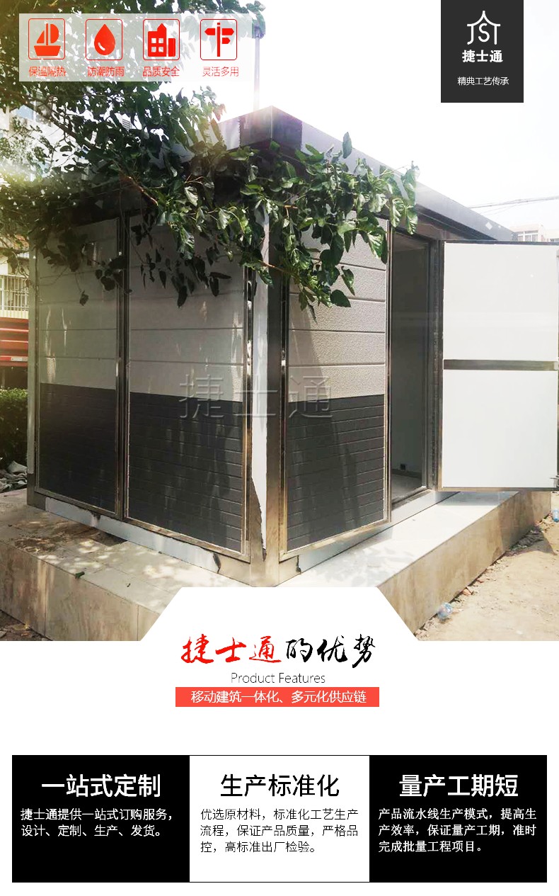 天津市捷士通科技有限公司坐落于美麗的天津市北辰區(qū)萬發(fā)科技園。占地面積20000平方米,是一家經(jīng)驗豐富設計、研發(fā)、生產(chǎn)、銷售環(huán)保移動房屋結合智能化一體的經(jīng)驗豐富生產(chǎn)供應商。聯(lián)系電話:15822882616。