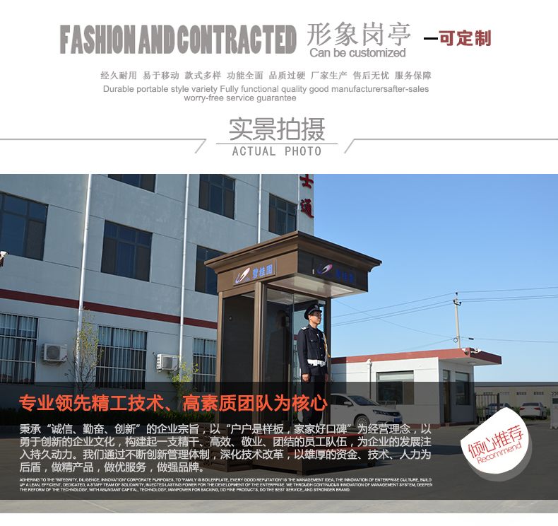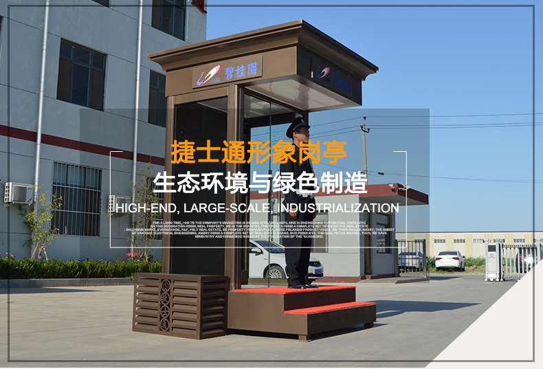 碧桂園形象站崗崗?fù)?,采用氟碳噴漆材質(zhì),配備專業(yè)空調(diào)外機,專業(yè)的排氣孔,能保證站崗人員的舒適度 。