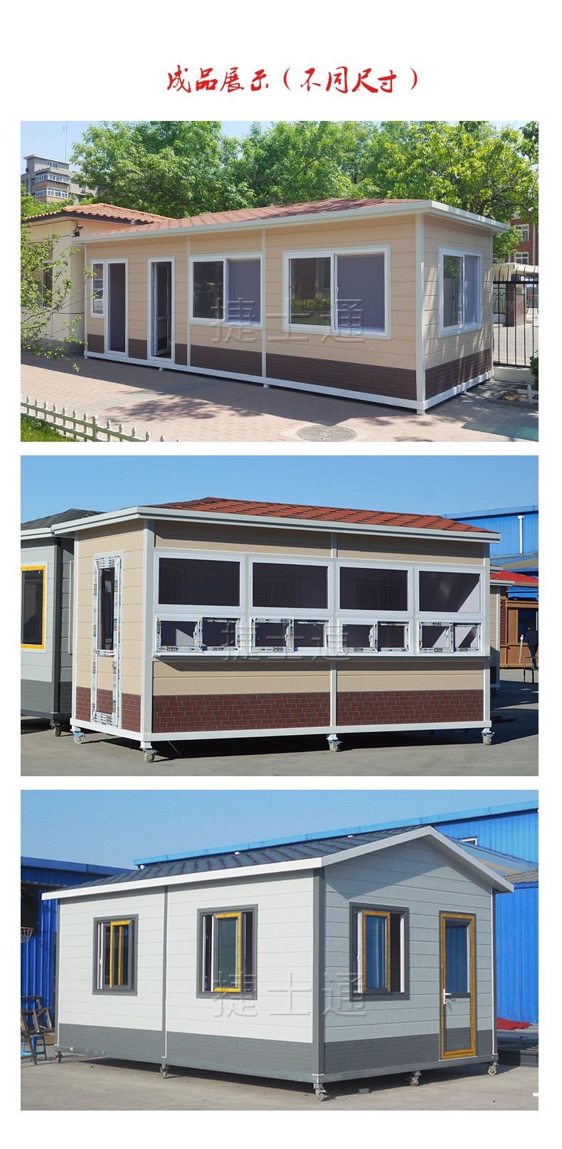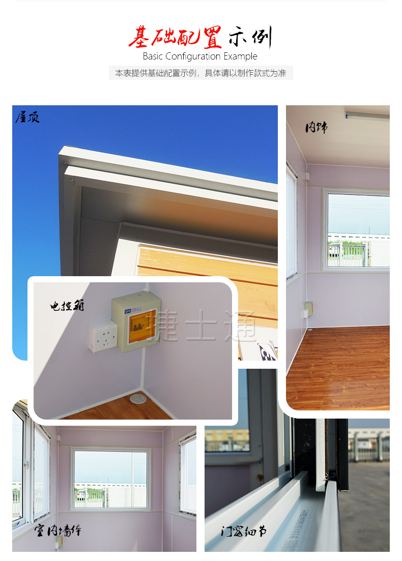 其他標(biāo)準(zhǔn)配置:墻體含保溫材料,外墻浮法玻璃,屋頂鍍鋅板靜電噴涂,PVC吊頂,地板可定做防滑鋁板/復(fù)合木地板,墻體玻璃材質(zhì):鋼化、中空、有色玻璃等可定做,電箱、開關(guān)、插座、暗敷電線、照明燈、桌面、抽屜、鍵盤托、空調(diào)架等。聯(lián)系電話:15822882616,公司網(wǎng)址:www.sqjskj.com