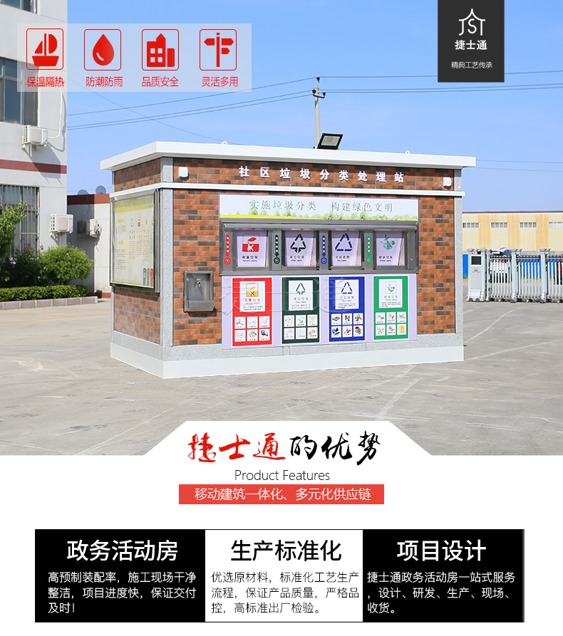 捷士通生產(chǎn)的主要是環(huán)保分類垃圾房和大型垃圾房。大型垃圾房廠家,擁有多條垃圾房產(chǎn)品線,垃圾房內(nèi)部配備各種技能技術(shù)和*技術(shù),在垃圾房領(lǐng)域占有制高點。