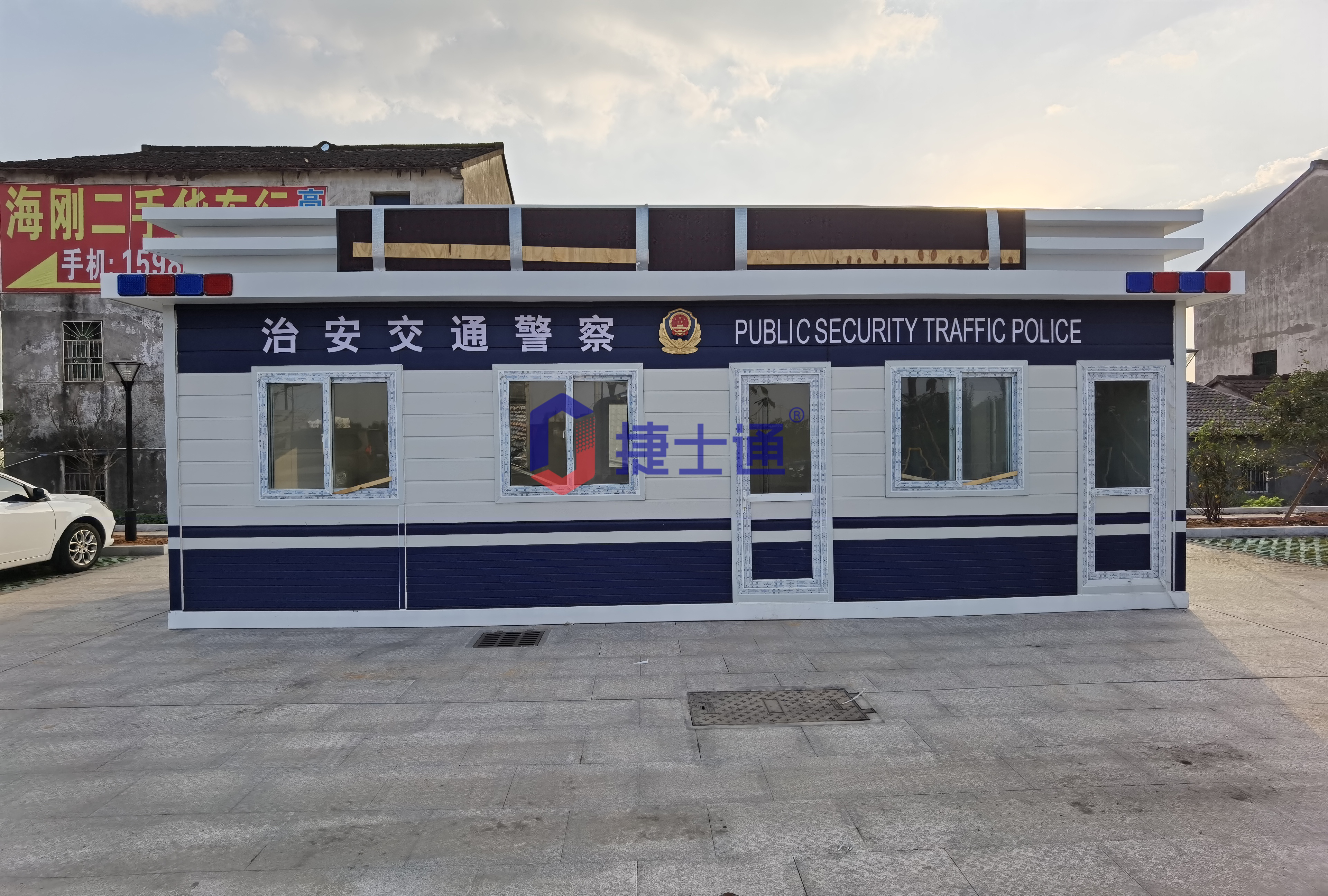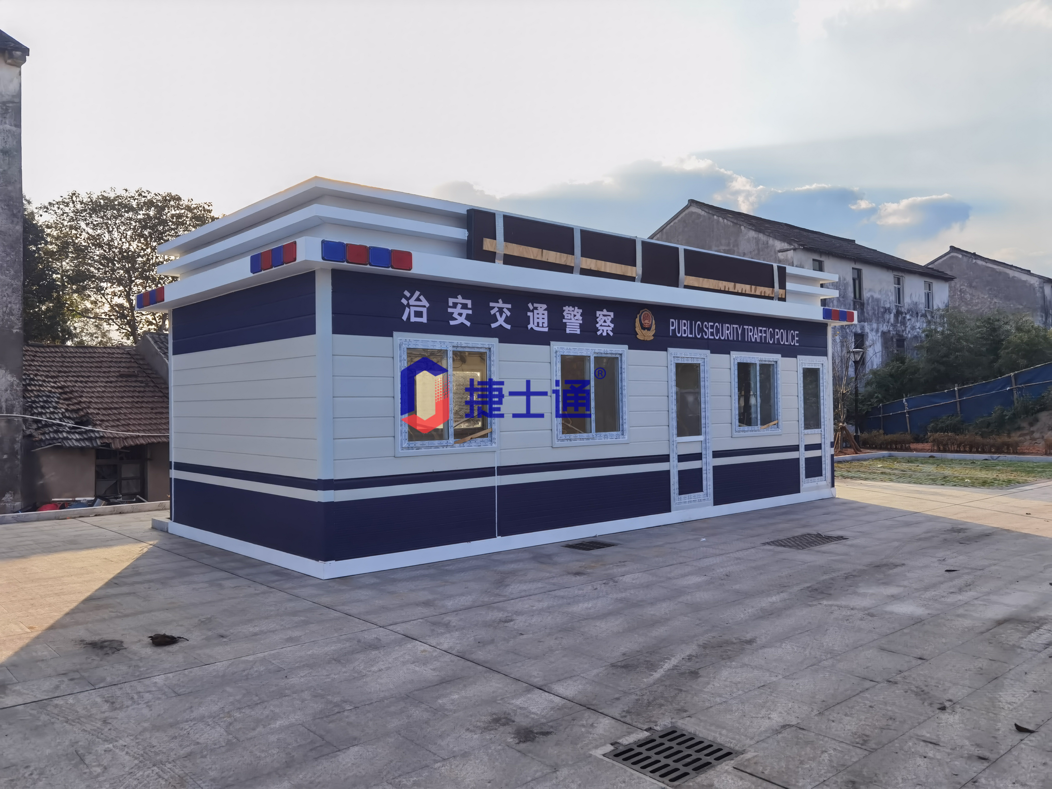 浙江紹興錢濱線與新圍路交叉口處,此處為車流量較大路段,為加強治安,預(yù)防早高峰出現(xiàn)的堵車等交通現(xiàn)象,特在此處設(shè)立一個大型治安的警務(wù)室,顏色采用藍白色,藍白色主要用于公安民警。尺寸為3.5*7米,室內(nèi)空間布局大,分別設(shè)有接警區(qū)、辦公區(qū)、休息區(qū)、監(jiān)控區(qū)、儲藏室??晒┒嗳送瑫r辦公。還配有:LED顯示屏、照明燈、辦公桌椅、儲藏柜、警徽等辦公用品。捷士通憑著豐富的生產(chǎn)經(jīng)驗,產(chǎn)品不僅外形美觀,整體采用方鋼龍骨焊接而成,穩(wěn)固耐用,使用壽命長達20年之久。