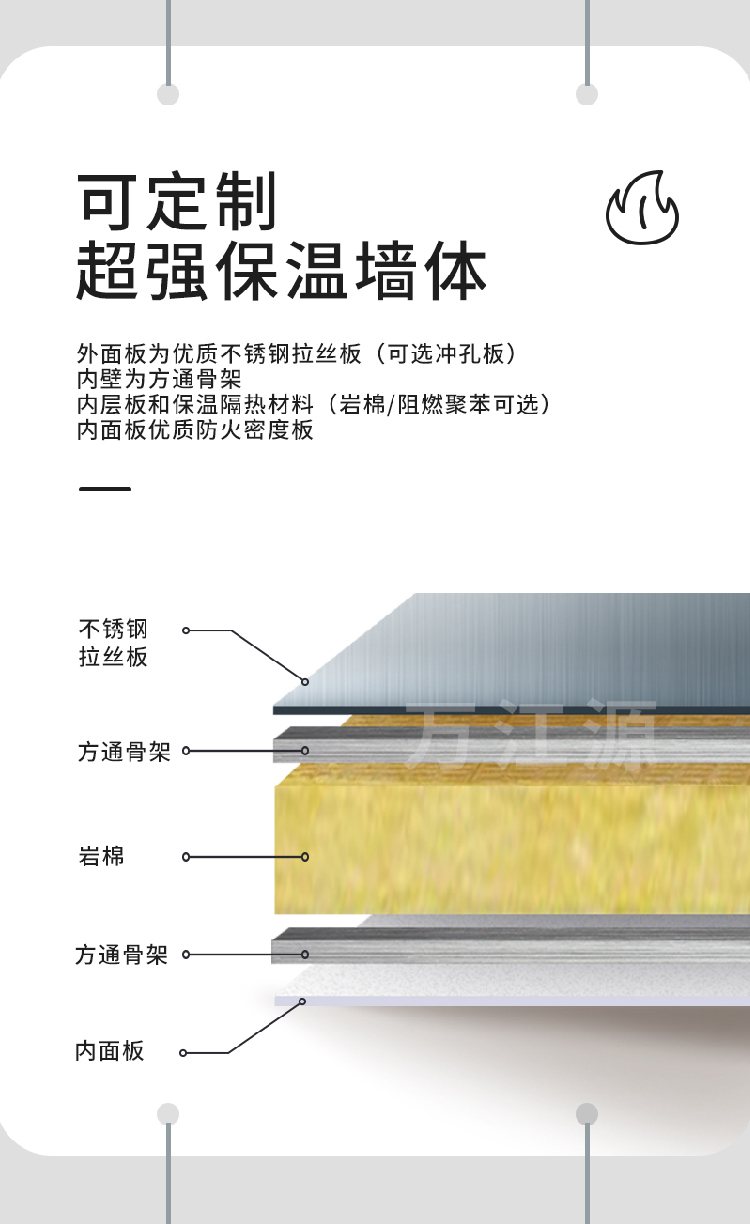 四、保溫好:這個(gè)方面是許多廠家不注重的,南方溫度較為適宜,因此不需要用到保溫,但是北方來說,保溫是必須要有的,北方冬天平均氣溫都在零度或者零下,因此保溫層和墻體厚度一般是80-100mm左右,保溫材料一般使用巖棉、擠塑板等。