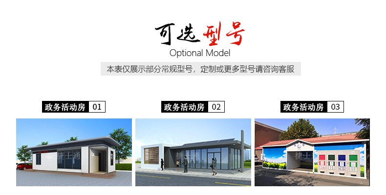 捷士通移動(dòng)房屋廠家,專業(yè)生產(chǎn)保安崗?fù)ぁ⒕瘎?wù)室、政務(wù)級(jí)活動(dòng)房、售貨亭、便民服務(wù)亭、垃圾分類房等中大型移動(dòng)房屋,100平米以下的政務(wù)級(jí)活動(dòng)房可根據(jù)場(chǎng)景靈活設(shè)計(jì)款式,做完整的配套設(shè)施,政務(wù)級(jí)活動(dòng)房采用高端板材,綠色環(huán)保,裝配率可達(dá)95%以上