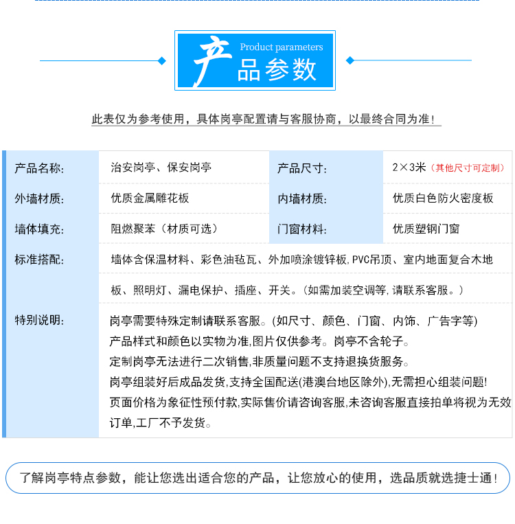 保安亭和警務(wù)室又有何異同呢?我們熟悉的保安崗?fù)ぞ褪且粋€小型崗?fù)ぃ话愣际驱埞呛附佣傻?,是保安人員工作、執(zhí)勤的地方。首先從外觀上,來看,警務(wù)室大多數(shù)以藍(lán)白相間為主,而保安崗?fù)た蛇x擇的風(fēng)格樣式就相對豐富很多,有不銹鋼、金屬雕花板、真石漆(噴砂崗?fù)ぃ┘扳伣饙復(fù)さ鹊?。而?/span>警務(wù)室作為公安部門的重要設(shè)施,會配備爆閃燈及LED顯示屏等,這些都是保安亭這類民用設(shè)施所不可采用的。治安崗?fù)ぃ巡煌趥鹘y(tǒng)的治安崗?fù)?,新型的治安崗?fù)ぜF(xiàn)代化信息平臺于一體,不僅維護(hù)群眾人身安全,還有利于打擊違法犯罪。嚴(yán)肅的治安崗?fù)?,給人一種威懾作用,同樣,在群眾需要幫助的時候,*時間挺身而出,送去溫暖。廠家咨詢電話:15822882616,公司網(wǎng)址:www.sqjskj.com。