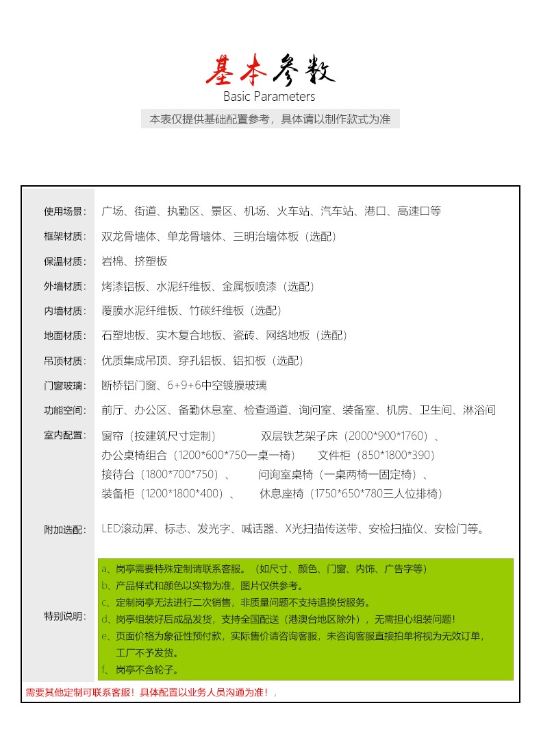 | 類型 | 檢查站警務(wù)室 | 顏色 | 可定做 | 運(yùn)輸方式 | 公路運(yùn)輸 | ||