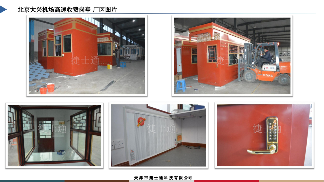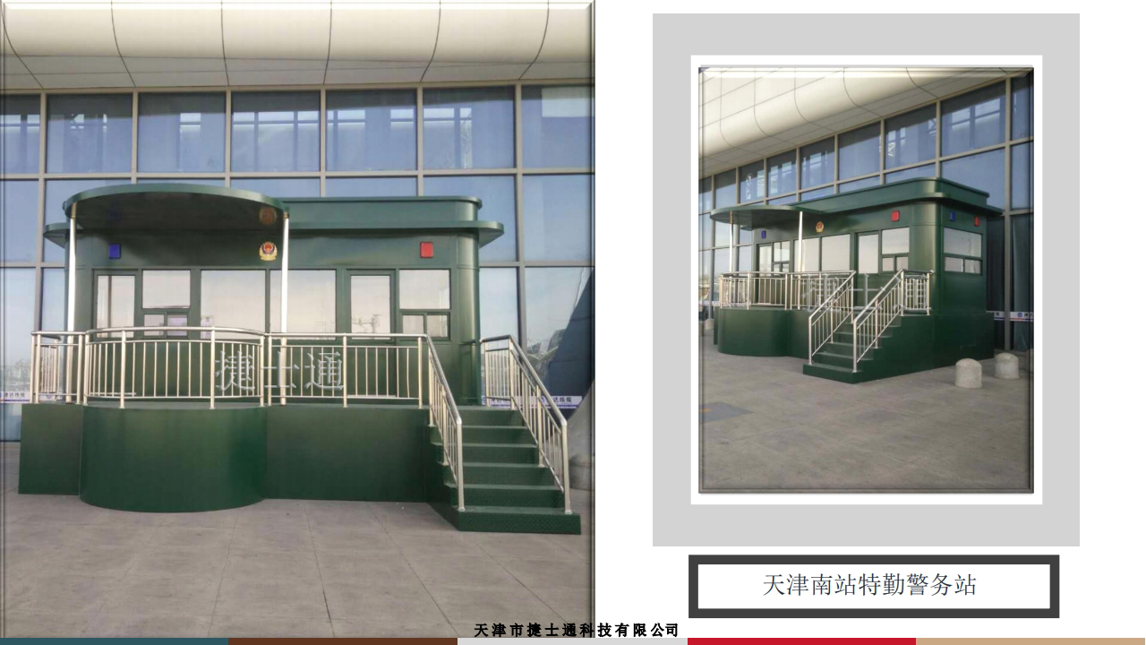 天津市捷士通科技有限公司從創(chuàng)建以來,一直潛心致力于崗亭的造型創(chuàng)新、品質的提升,短短幾年時間,成為了同行業(yè)的佼佼者。公司的高速發(fā)展,離不開公司高素質的人才隊伍和先進的經(jīng)營管理模式。公司一向本著“質量求生存,創(chuàng)新求發(fā)展”的精神,引進國內(nèi)外先進的機械設備,應用新技術、新工藝、新材料注重質量管理體系的完善,培養(yǎng)了大批經(jīng)驗豐富的技術人員,以“科學、嚴謹、務實”的經(jīng)驗豐富精神,生產(chǎn)出各種不同的檔次的“質優(yōu)、價廉、新穎”產(chǎn)品以滿足各類客戶的不同需求。 通過各部門的效率高 協(xié)作,公司力求從產(chǎn)品生產(chǎn)到銷售的每一細節(jié)都做到精益求精,以實現(xiàn)公司效益與客戶利益的雙贏共贏。 天津市捷士通科技有限公司自建立以來,以其過硬的產(chǎn)品質量、時尚典雅的外觀設計、合理的價格、健全的營銷網(wǎng)絡、優(yōu)良的售后服務贏得了廣大客戶的信任和青睞。 捷士通崗亭以出眾的品質,超卓的性能和優(yōu)雅的外觀受到廣大消費者的追捧,成為黨政機關、企事業(yè)單位、場館、bu隊 、高價住宅區(qū)、停車場、售賣場所、旅游景區(qū)的優(yōu)選 產(chǎn)品.中國石油、天津西站、天津東站、天津市容委、天津建筑設計院、天津南開大學、天津(水滴)體育館、正信集團、寧發(fā)集團、濱海旅游區(qū)、游輪母港。 天安門服務亭、兩會安檢亭、朱日和軍演防彈崗亭、央視朗讀亭、碧桂園地產(chǎn)、華夏幸福地產(chǎn)、北京世園會志愿者服務亭等等都是問我們的客戶。